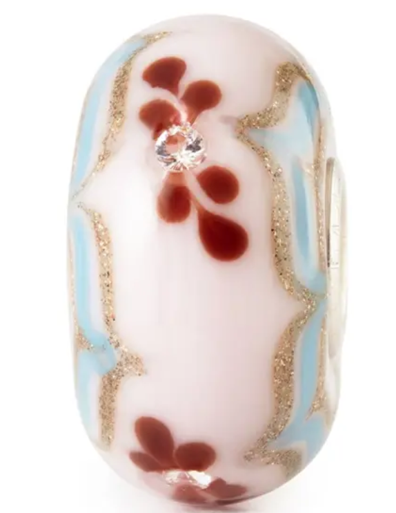 Wie feines Gewebe aus Blütenblättern, durchwirkt vom zarten Schein des Tages. Dieses Bead erinnert an vergessene Gärten, an den ersten Sonnenstrahl auf zarter Haut, an den Moment, in dem Schönheit still wird. Ein Hauch von Licht, eingefangen in floraler Leichtigkeit – so filigran, so voller Seele. Für jene, die mit dem Herzen sehen.
