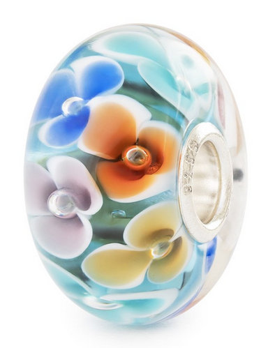 Zarte Blumen in Regenbogenfarben schweben vor einem klaren blauen Hintergrund und fangen das fröhliche Gefühl eines Sommertraums ein. Jeder Bead ist handgefertigt aus Kunsthandwerksglas, wobei jedes Detail so gestaltet ist, dass es Leichtigkeit, Farbe und Kreativität vermittelt.