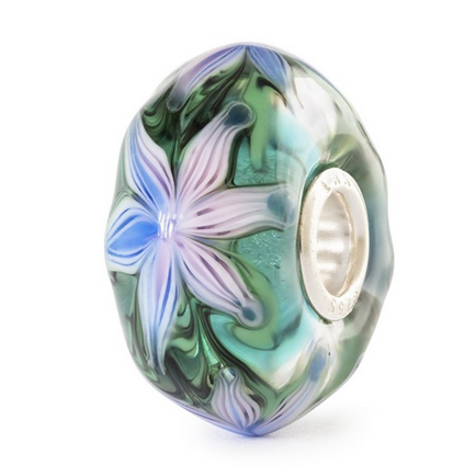 Sanfte Wellen aus Blau und Grün umfließen eine feine violette Blüte, die im Glas schwebt wie eine stille Spiegelung auf einem ruhigen See. Jeder Bead wird mit großer Sorgfalt aus kunstvollem Glas von Hand gefertigt und trägt jene stille Stärke in sich, die auch im Aufruhr ihre Ruhe wiederfindet.