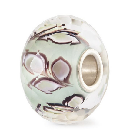 Sanfte Salbeitöne mit feinen Mauve-Akzenten schaffen einen ruhigen, natürlichen Ausdruck. Die facettierte Oberfläche hebt die zarten Blattformen hervor, die im Glas schweben – wie ein leiser Atemzug der Natur, eingefangen im Licht.